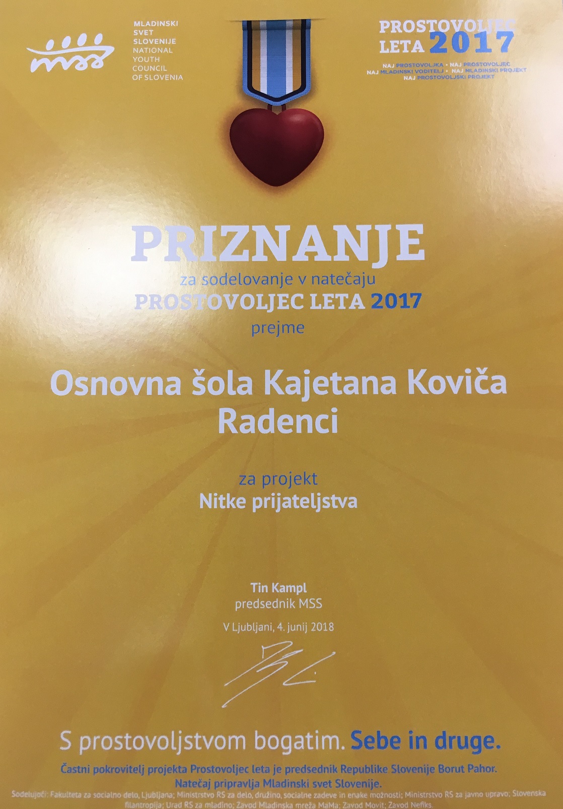 Učenci prostovoljci Osnovne šole Kajetana Koviča Radenci so skozi celo šolsko leto 2017/2018 pridno sodelovali v šolskem projektu "Nitke prijateljstva". Medgeneracijsko sodelovanje je potekalo med našo šolo in DOSOR-jem preko različnih aktivnosti. Povezovali smo se na različnih področjih kot so: športne igre, razne delavnice, keksijada, obiski učencev ob pustu in drugih dnevih ter kulturna srečanja ob začetku in koncu šolskega leta. Naš projekt vsako leto prijavimo na razpis, ki ga pripravi Mladinski svet Slovenije, pod okriljem predsednika gospoda Boruta Pahorja. Tako smo v ponedeljek, 4. 6. 2018, prejeli priznanje na Brdu, kjer je potekala podelitev in srečanje s predsednikom.